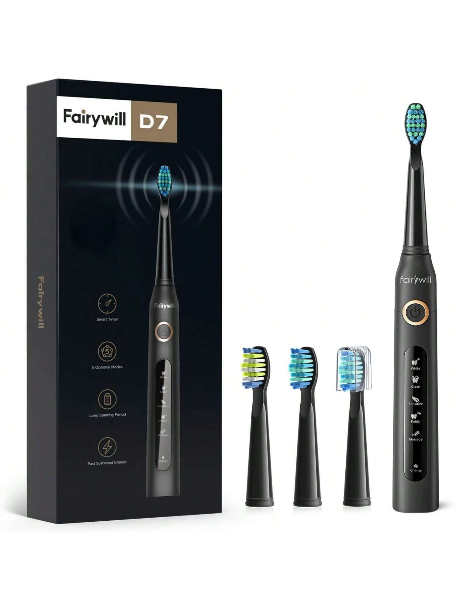 Experience a whole new level of oral care with our Sonic Electric Toothbrush. Designed to provide superior cleaning, this rechargeable power toothbrush is a must-have for maintaining a healthy and dazzling smile. With its sleek black color, it adds a touch of sophistication to your daily routine. Equipped with four brush heads, our toothbrush ensures thorough cleaning from every angle. The high-frequency sonic technology delivers up to 40,000 strokes per minute, effortlessly removing plaque and stains for a dentist-like clean feeling. Choose from five different modes - Clean, White, Polish, Gum Care, and Sensitive - to customize your brushing experience according to your needs. Featuring a built-in smart timer set at two minutes, our toothbrush encourages optimal brushing time for each session. This helps you achieve consistent results while preventing over-brushing or neglecting any areas. The timer pulses every 30 seconds as a reminder to switch quadrants and ensure even coverage throughout your mouth. With its rechargeable battery, you can enjoy long-lasting use without the hassle of constantly replacing batteries. Simply connect the toothbrush to the included charging base when needed. Compact and travel-friendly, it easily fits into your toiletry bag for on-the-go convenience. Upgrade your oral hygiene routine with our Sonic Electric Toothbrush today and unlock the secret to a healthier smile.