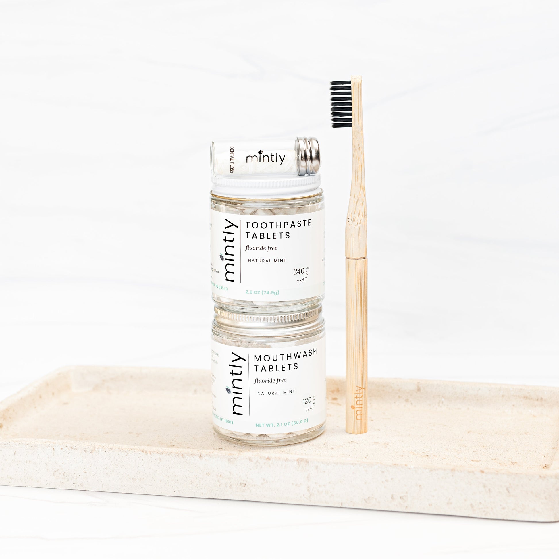 Includes: toothpaste tablets fluoride free (4 month supply), mouthwash tablets (4 month supply), an eco toothbrush, and eco floss.