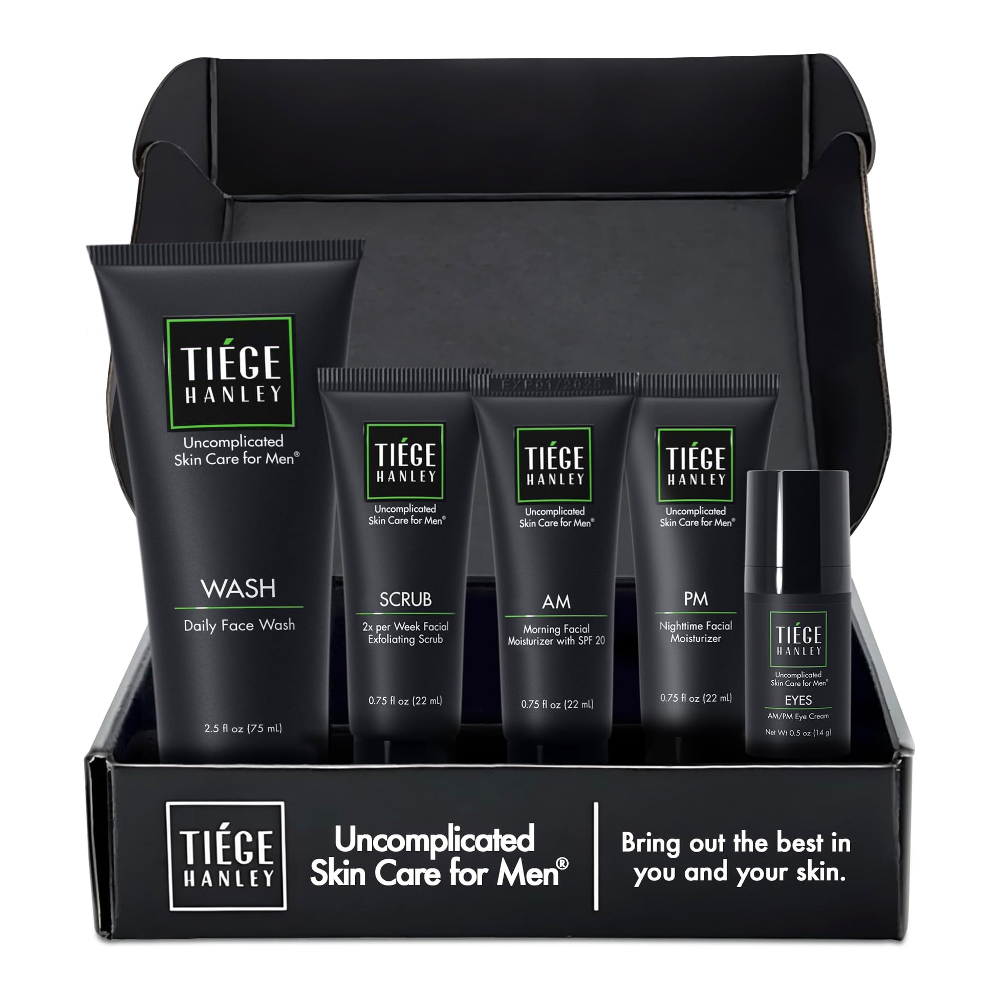 - Enhance Your Handsome: Products in the Tiege Hanley Advanced Routine for Men work together to help smooth, hydrate, and protect your skin while fighting off crow’s feet and dark circles. Includes face wash (2.5oz), exfoliating scrub (0.75oz), AM facial moisturizer with SPF20 (0.75oz), PM moisturizer (0.75oz), eye serum (0.5oz), and simplified usage guide. This Level 2 set provides a 30-day supply that’s great as a starter pack for you or a gift for someone else.